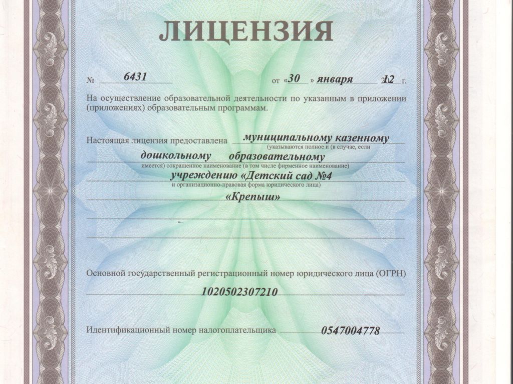 | Полное наименование образовательной организации* | Муниципальное казенное дошкольное образовательное учреждение "Детский сад № 4 "Крепыш"городского округа "город Кизляр" |